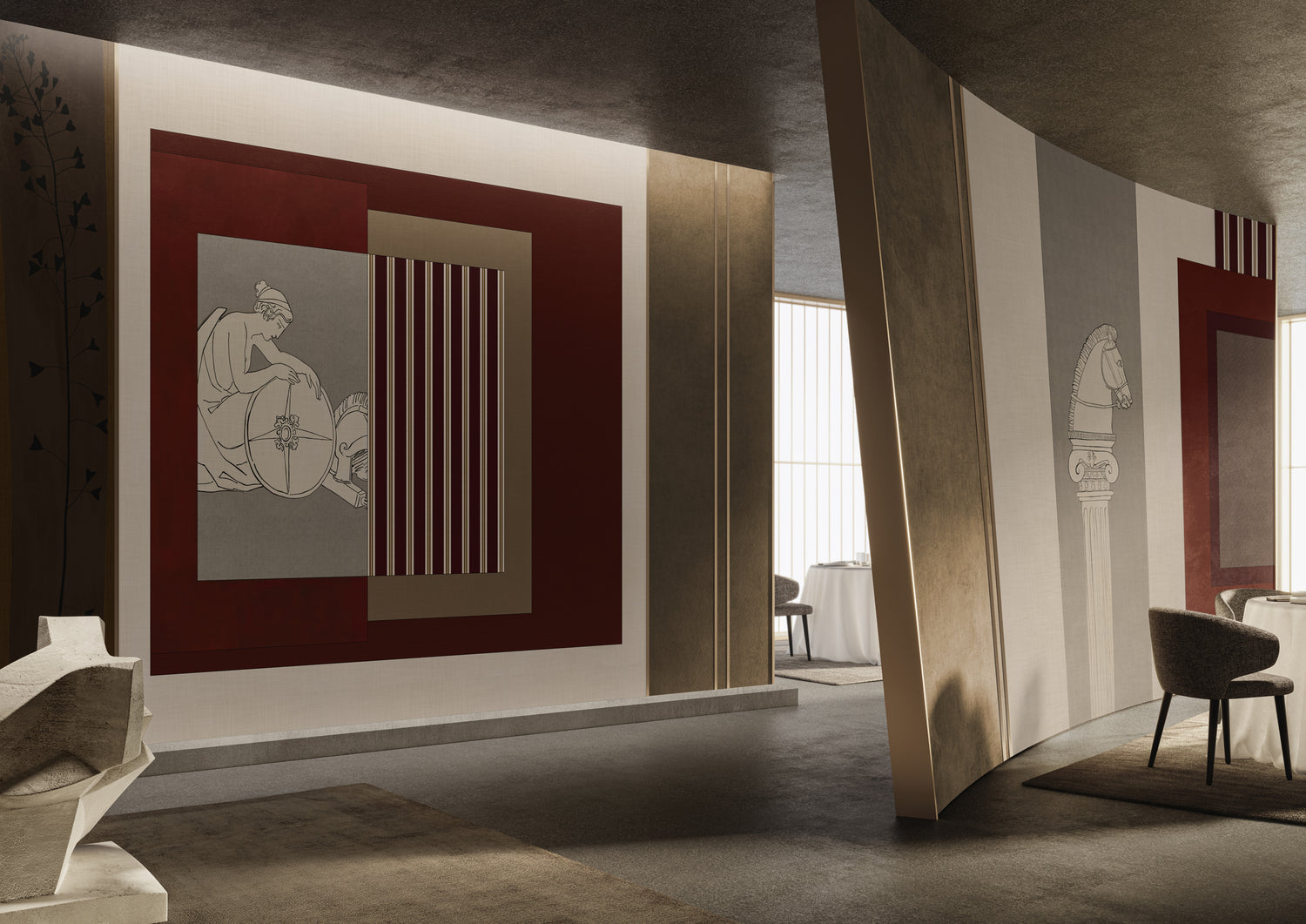The heroes of Greco-Roman mythology and epic tales along with classical architectural references are reimagined in a collection for modern interiors.The wallcovering’s aesthetics are a contemporary take on neoclassicism, with a skillful interplay of scenery that reveals sharp strokes defining the figures and the details of pilasters and capitals evoking the sinopias of the grand wall frescoes of the past.