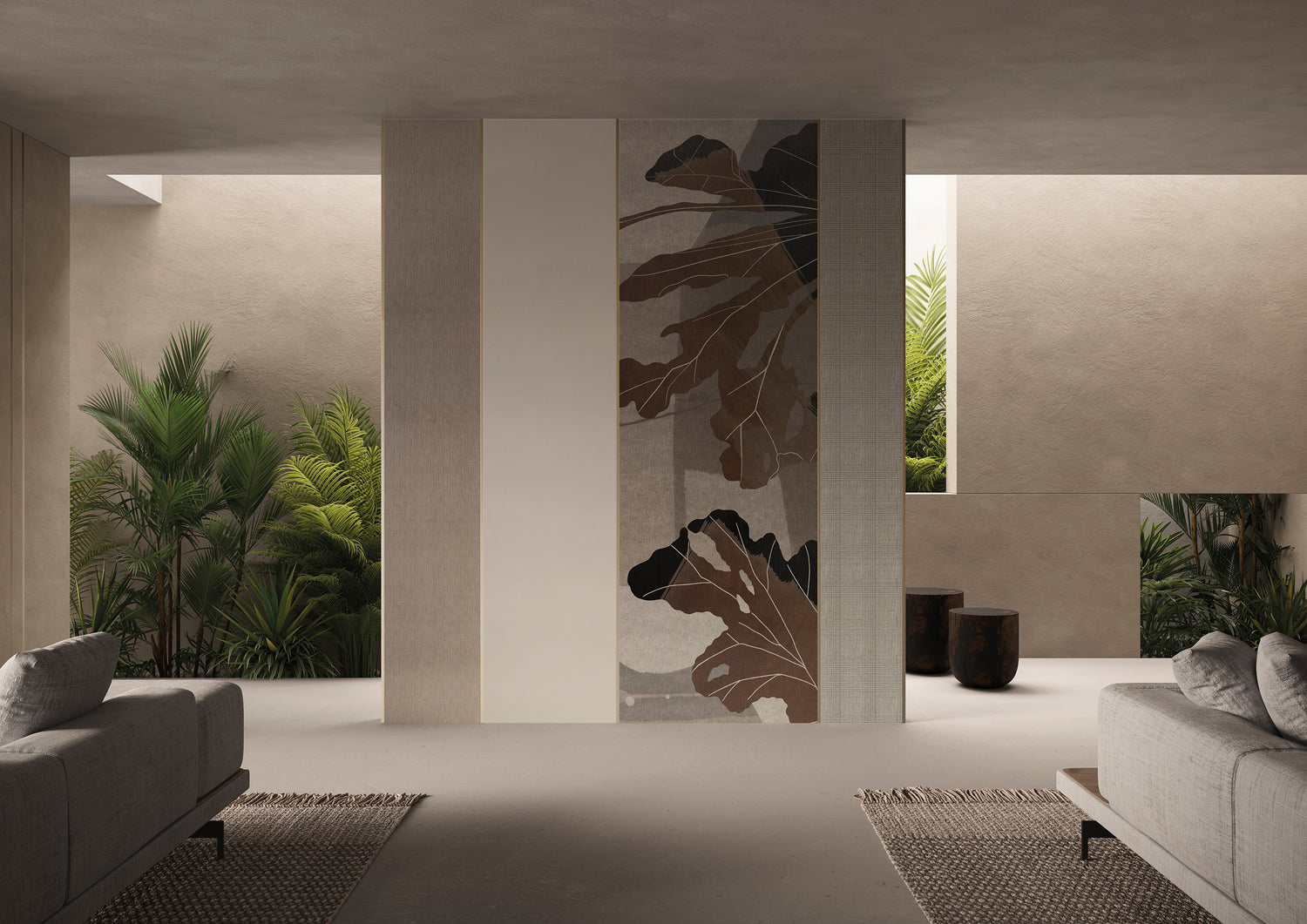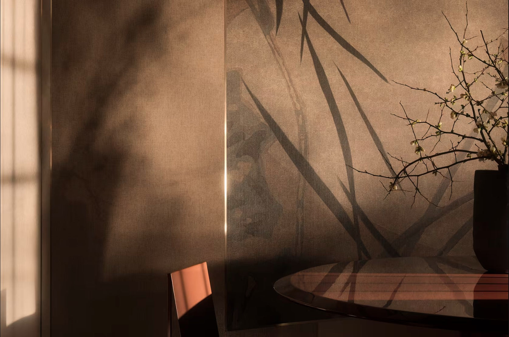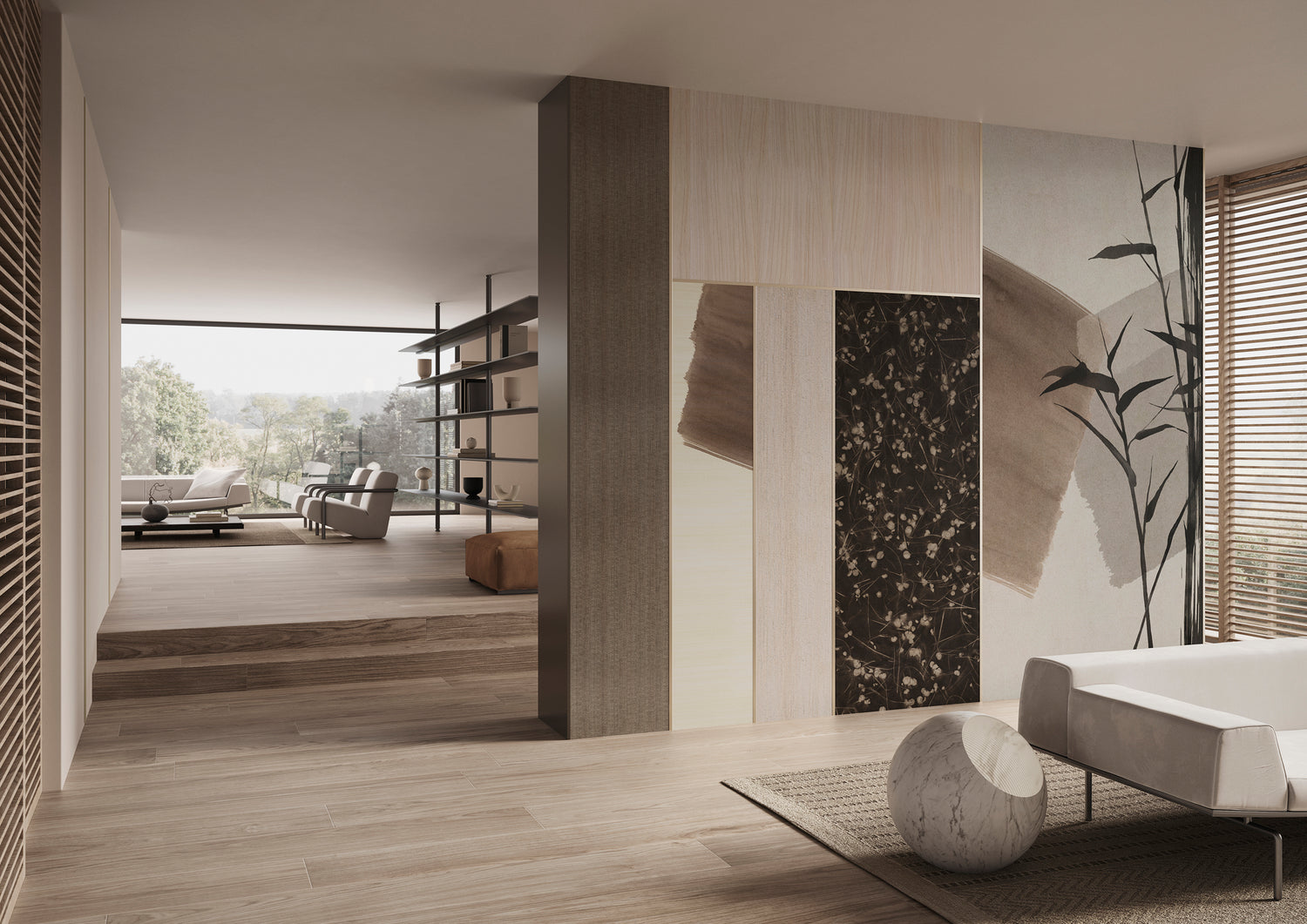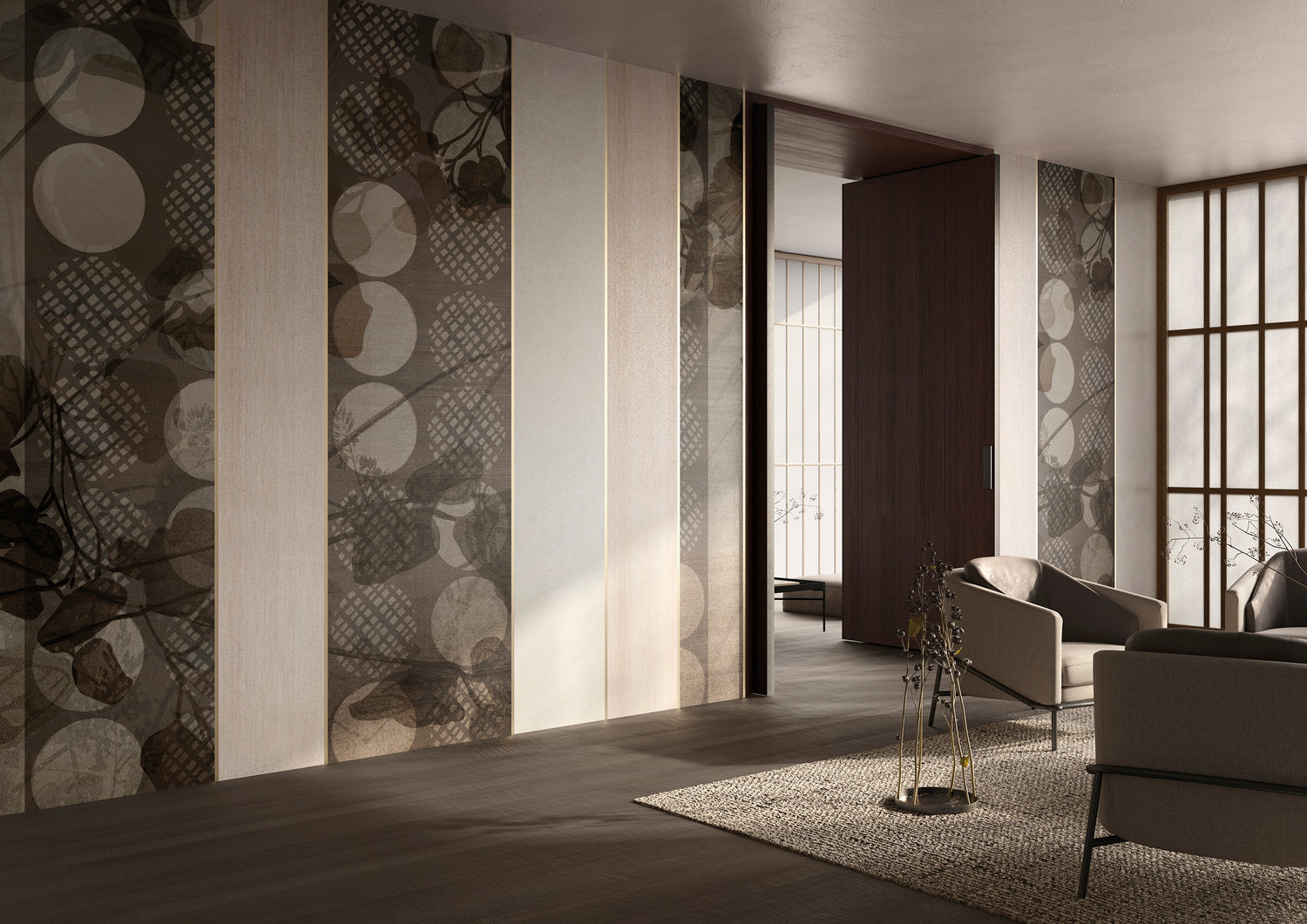 The aim is to convey a calm, rarefied elegance by evoking the emotion of an encounter between East and West, between contemporaneity and tradition, as well as between different materials, creating unprecedented effects.The figure of the geisha, Madama Butterfly, is the main character who brings the scene to life. An imaginary silhouette that moves in architectural spaces defined by soft tones and precise rhythms, interrupted by variations in sequence and invigorated by natural stylistic features such as reeds and leaves.